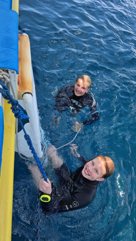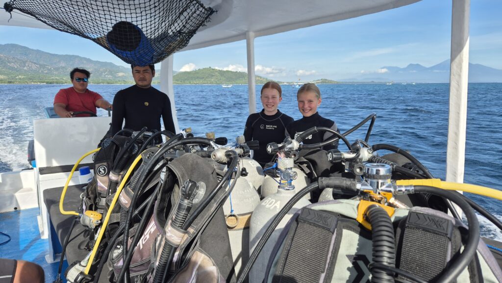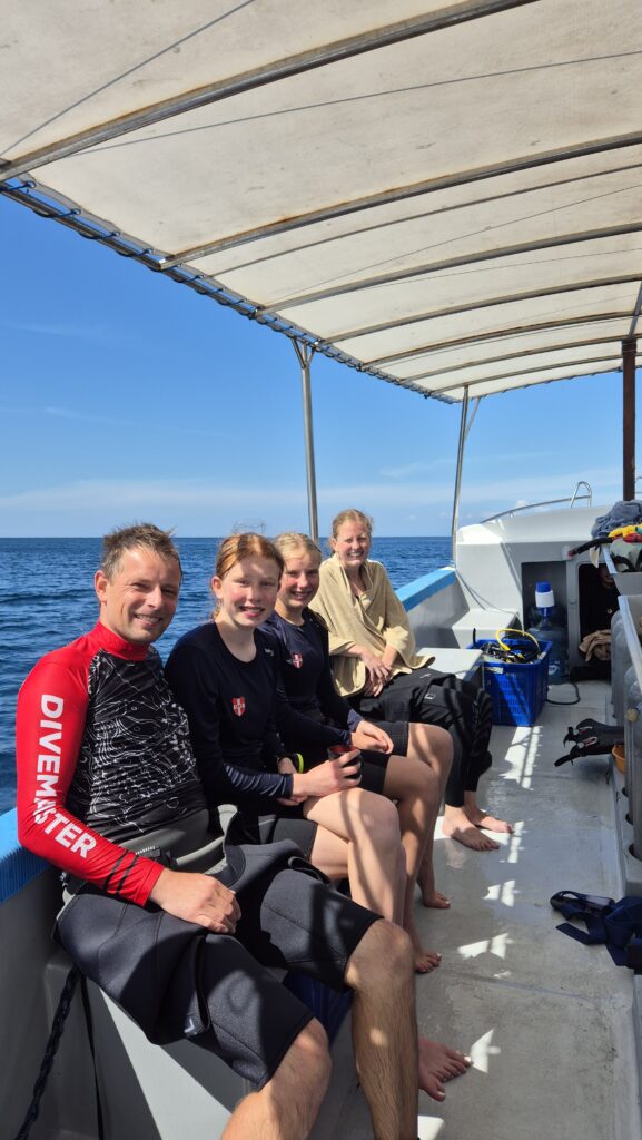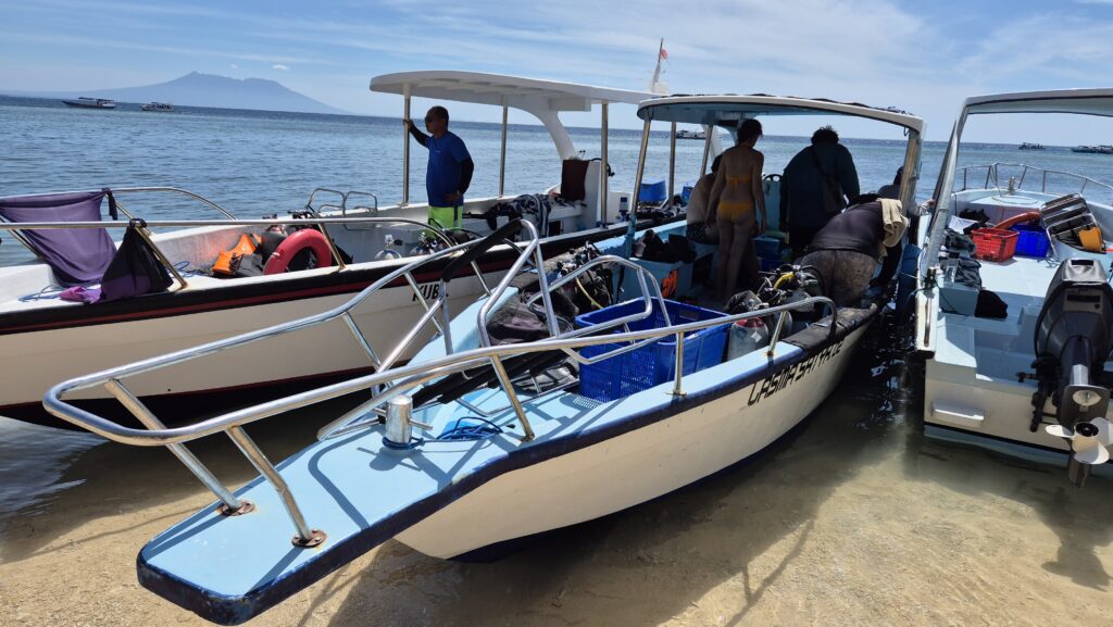 Vi har været afsted på en del dykkerture. Da dykkerstederne ligger tæt ved – nogle af dem 3 minutter i båd fra kysten – er dykkerdagene meget mere overkommelige end da vi dykkede fra Sanur. Ingen lange transportdage i trafik, ingen store afstande. Det har vi været glade for. Og dykningen er god. Vi har set skildpadder, hajer, makrelstimer, tun, alskens koralfisk, sågar delfiner en dag fra båden. Det er teknisk meget let dykning. Her er ingen bølger, ingen strøm og sigtbarheden er god. Det kan ikke blive meget nemmere.