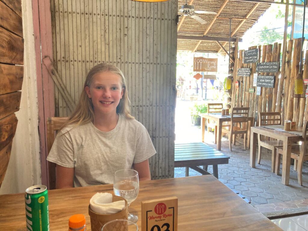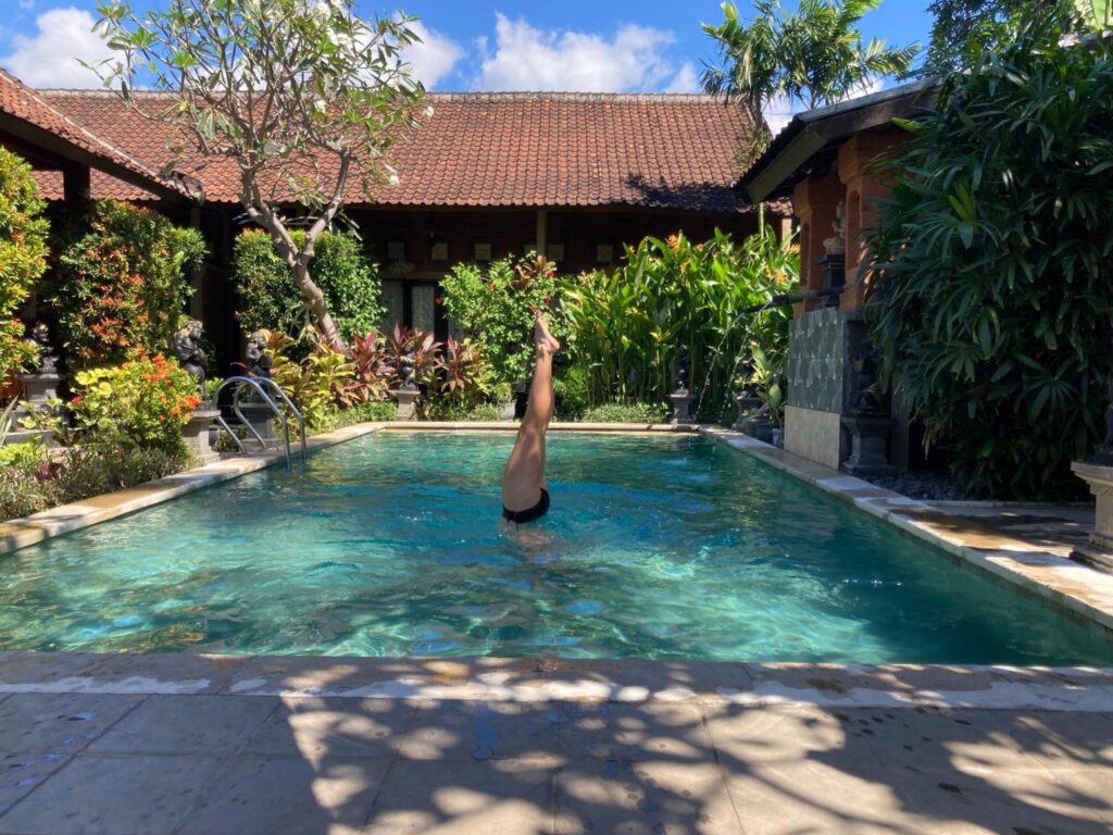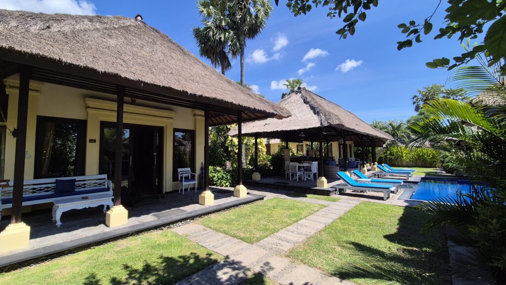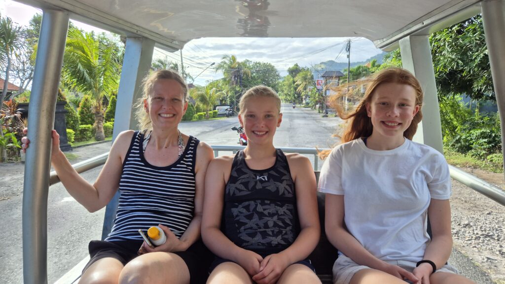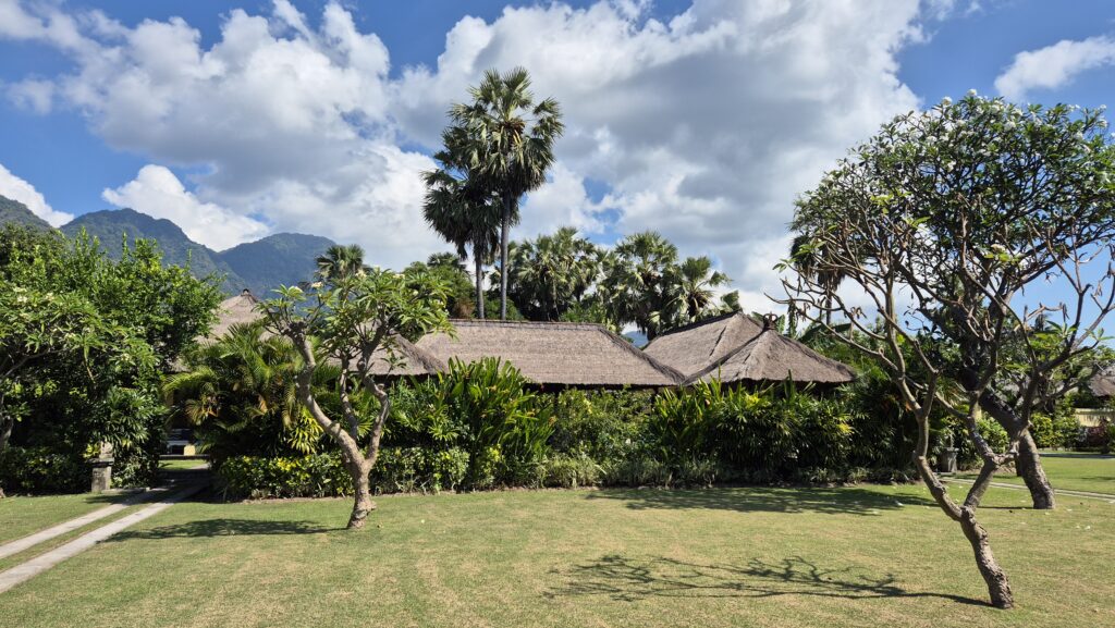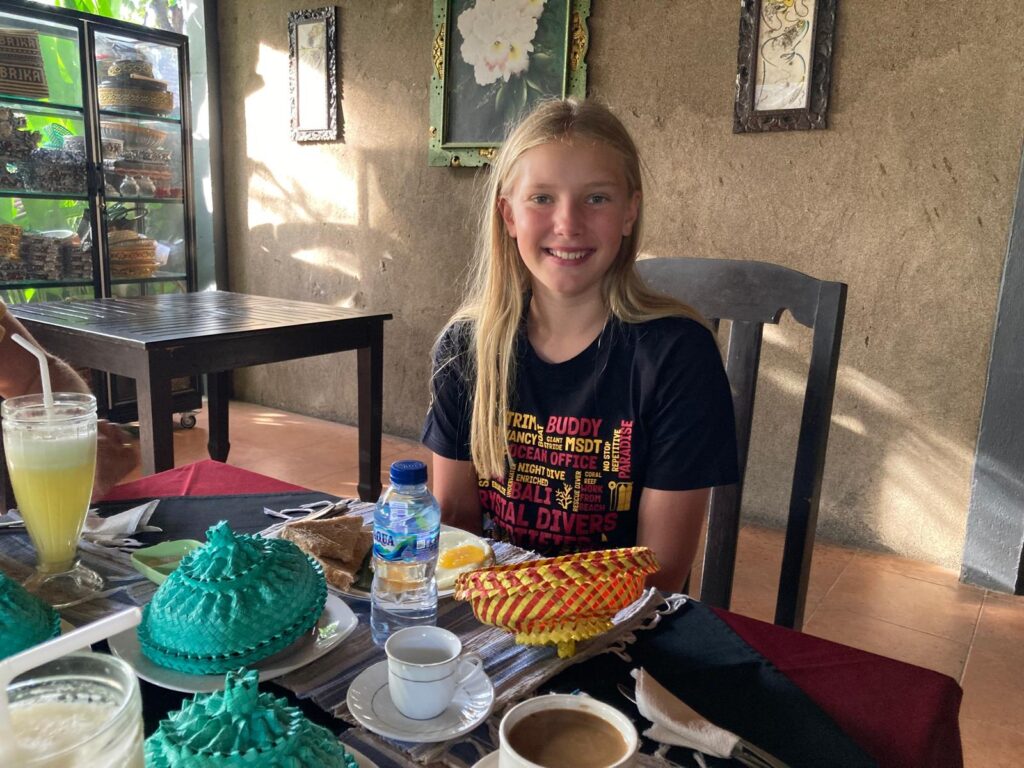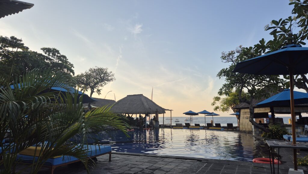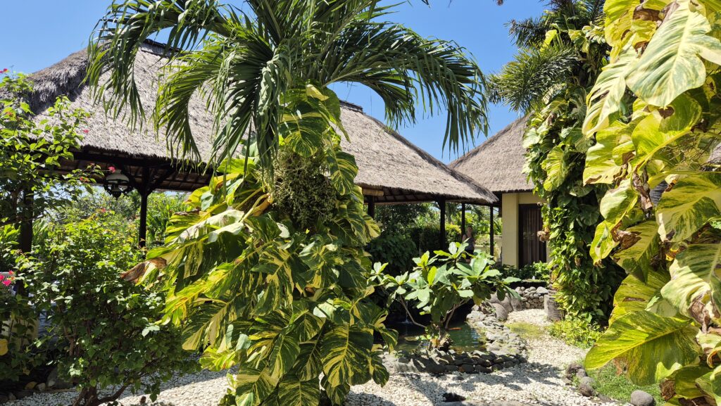 Vi har været ramt af sygdom. Det var blæsevejr et par dage, og blæsten fra de bagvedliggende bjerge førte noget influenzalignende med sig. Vi troede ikke rigtigt på det til at starte med, men indoneserne, inklusiv lægen, siger alle det samme. Først Helle, så Emilia, så Karoline. Til sidst fik Emilia ondt i ørene og lægen sagde, at hun har fået en infektion i det ydre øre fra dykning. Det har forsinket os en del, og det betyder, at vi ikke når alt det, vi havde tænkt os. Lombok og Gili øerne må vi tage en anden gang. Til gengæld har vi det jo rigtig godt her i Pemuteran, og vi nyder den smukke natur i bjergene og havet. Efter vores ophold hos Made måtte vi flytte hotel og er lidt tilfældigt landet på et vildt luksus resort. Pigerne nyder det, og forældrene holder en pause.
